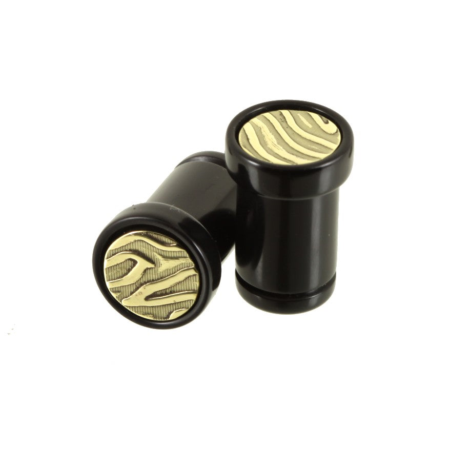 Hand-carved in Delrin and polished to a gloss finish with our Flow Brass inlay which is fully hardware set into the plug for a set of well made adhesive-free set of plugs.
