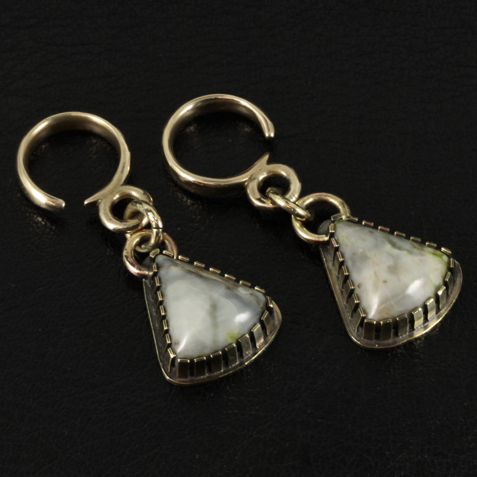 Comprised of our Bronze Loop Drop Hanger, I've fabricated a solid brass castellated bezel setting to surround a lovely plectrum shaped Iona Green Marble cabochon, This one features mostly light & dark grey tones, with small amounts of green.