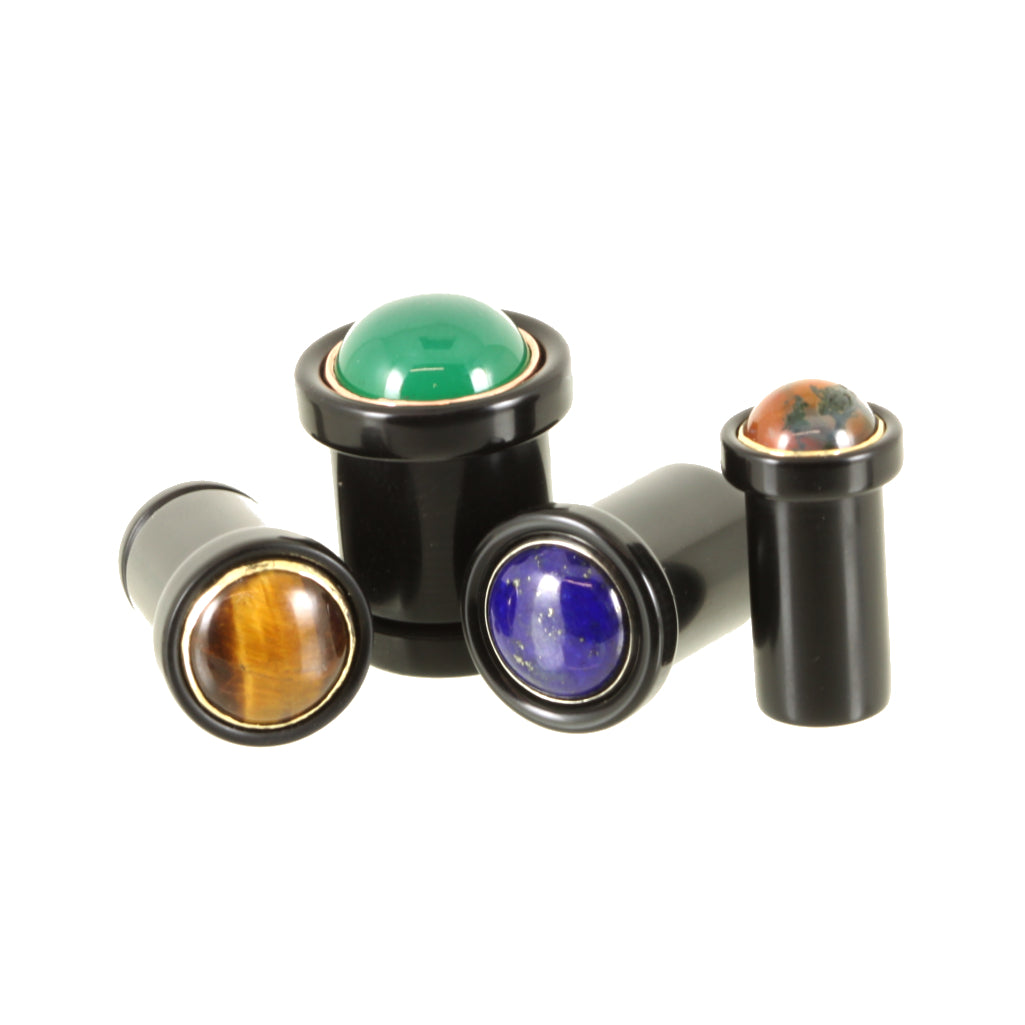 Individual Delrin Single Flared Plug with hardware set maker's choice cabochon stone inlay.